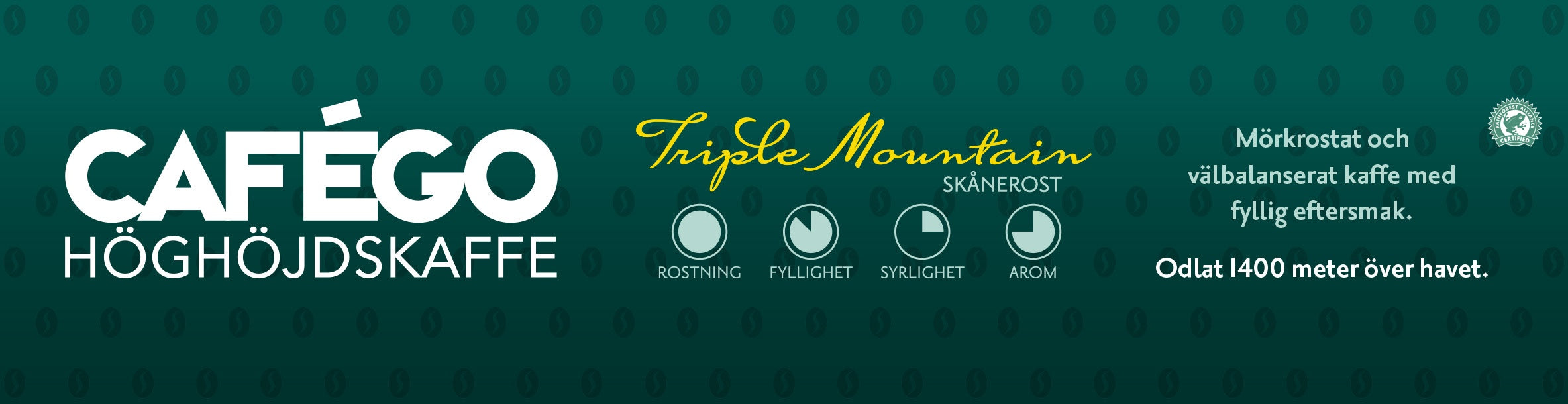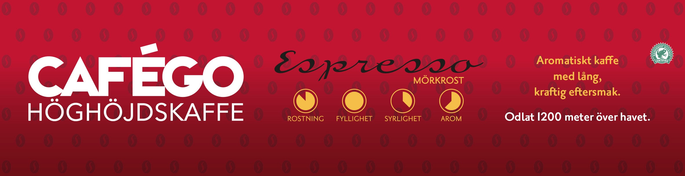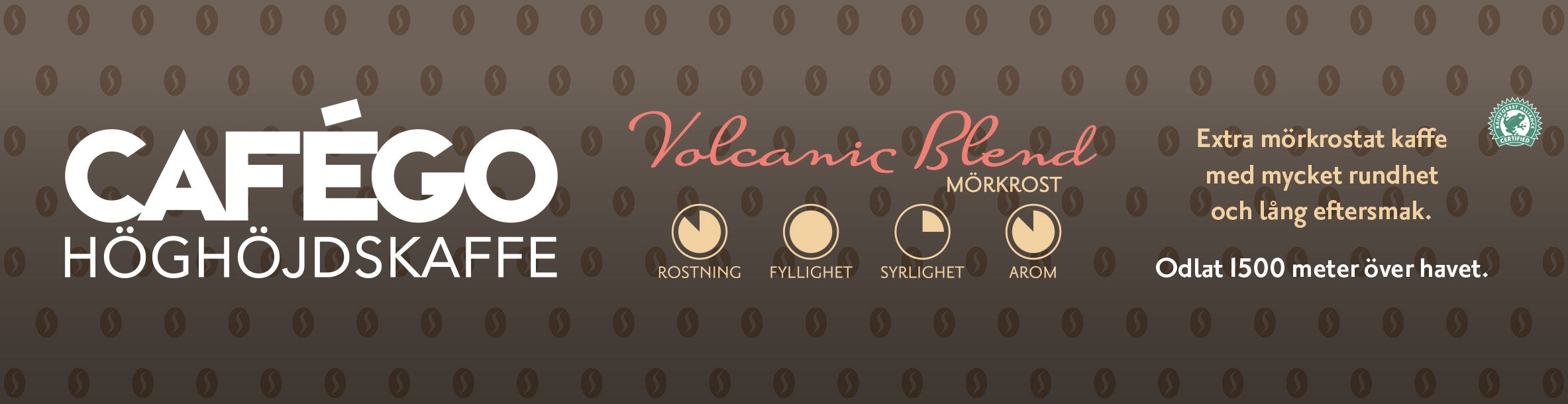 Minst 50% av kaffebönorna är plockade på över 1200 meters höjd. En välbalanserad blandning av milda Arabicabönor från Östafrika, Colombia och Brasilien, samt en del Robustabönor från Vietnam för en extra kick.